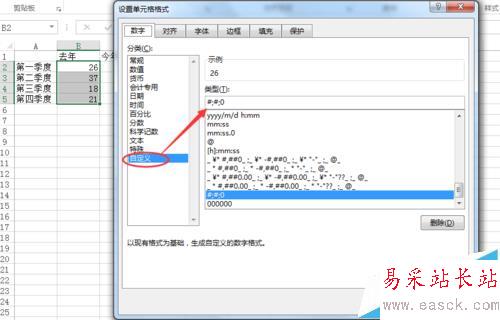 6、在“設置單元格格式”窗口中,選擇“自定義”,然后類型選擇#;#;0,如下圖所示;