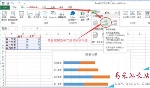 3、鼠標左鍵選中如下圖所示二維堆積條形圖圖標,即可生成下圖所示水平柱狀圖;