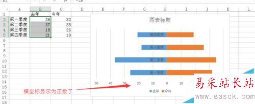 4、此時生成的柱狀圖是分布在縱坐標的同側的,我們現在把左側(此處為B列)的數字前面都加上負號,如下圖所示,柱狀圖分布在縱坐標兩側了;