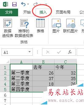 2、按住鼠標左鍵選中數據區域,然后點擊最上方菜單欄中的“插入”,如圖所示;