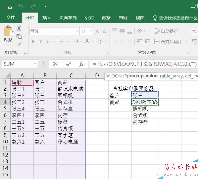 比如在下表中,我們?cè)贓3單元格上輸入函數(shù)=VLOOKUP(E3,A:B,2,0),只能提取出張三購(gòu)買的第一個(gè)商品。