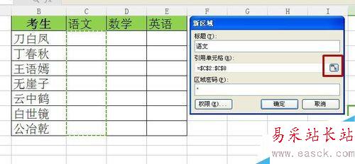 3、在新區域對話框中進行設定,標題寫語文,引用單元格區域就是語文老師要編輯的區域,點擊右邊的方形圖標,手動選擇區域。區域密碼設定,該密碼就是在語文老師編輯時會利用到,每科設置不同的密碼。