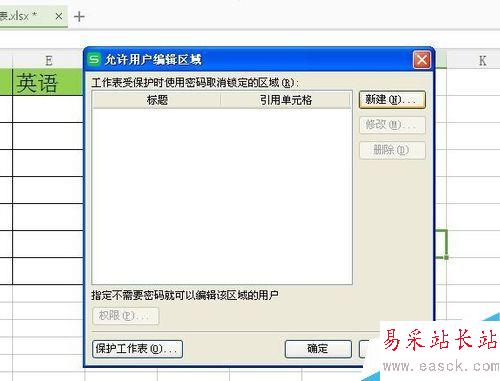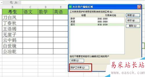 4、利用同樣的方法,新建數學、英語的允許編輯區域。完成的區域會顯示在對話框中,完成之后,點擊保護工作表。