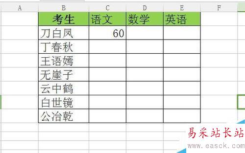 1、打開excel工作表格,以下面的表格為例,各科成績需要各科老師將分數錄入完成。將對語文、數學、英語分別限制編輯。