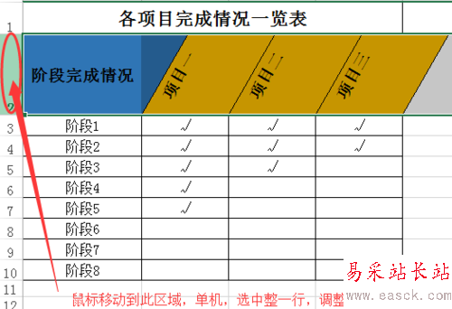 4、將鼠標(biāo)移動(dòng)到圖示區(qū)域,出現(xiàn)向右的黑箭頭→時(shí),左鍵單擊,即選中這一行,將鼠標(biāo)移動(dòng)到單元格的下邊緣,變成一條線(xiàn)+上下箭頭的形狀時(shí),即可調(diào)整行高。也可以單擊鼠標(biāo)右鍵,選擇“行高”,在對(duì)話(huà)框輸入行高值,調(diào)整行高。