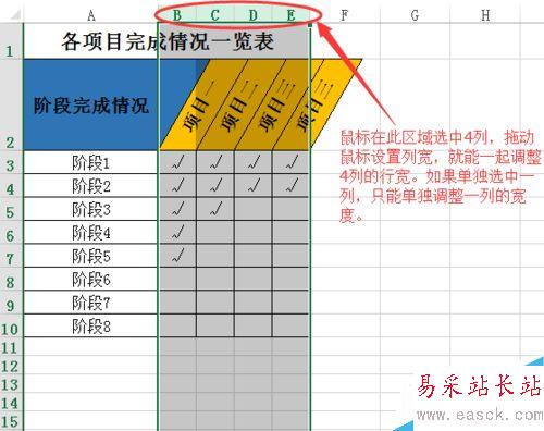 5、調(diào)整列寬。需要調(diào)整幾列的寬度一致,可以將B/C/D/E幾列一起選中,方法還是在所示區(qū)域用鼠標(biāo)拖動(dòng)選擇。選中后,調(diào)整任意一列寬度,幾列寬度就會(huì)同時(shí)變化。
