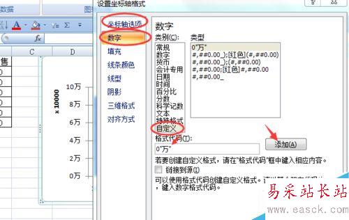 點擊”數字 ",自定義:0"萬"添加(此時圖表中左上角會出現(xiàn)*10000 選中刪除即可)
