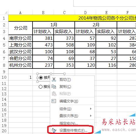 2、右擊——設置控件格式。如圖所示,進行單元格鏈接設置。