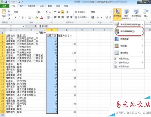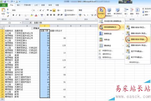 3、點(diǎn)擊菜單“開(kāi)始”、“條件格式”、“項(xiàng)目選取規(guī)則”;例,如圖