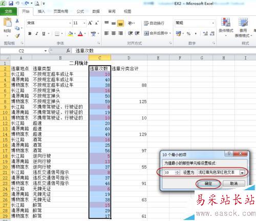 6、完成后10個(gè)最小的數(shù)值就會(huì)顯示成“淺紅填充色深紅色文本”。例,如圖
