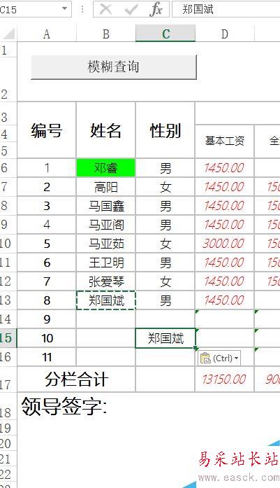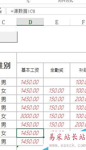 2、在例子中我們可以看到單元格內的數據來源于數據源這張工作表中的單元格數據引用,所以我們修改對應數據源工作表的單元格內的數據會顯示在5月工資的工作表中。