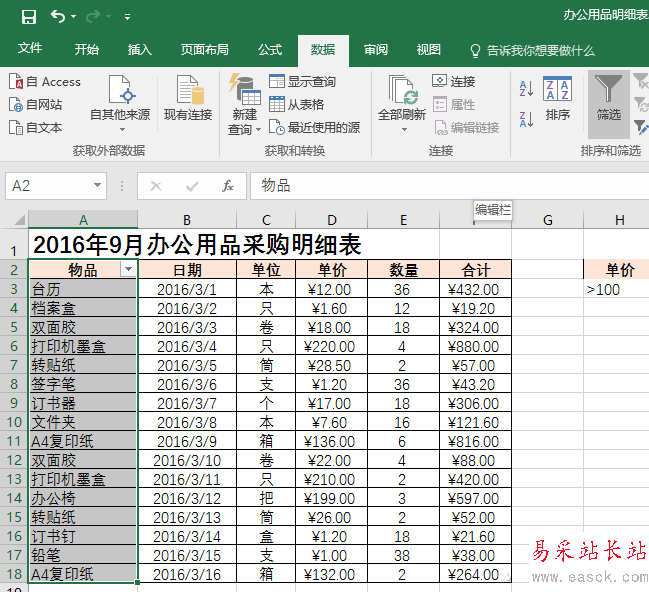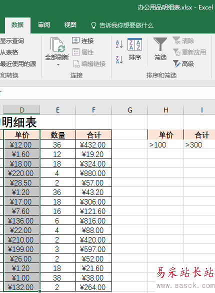 假設已有一個公司辦公用品采購的明細表。現在需要快速將那些單價超過100元的,或者總價超過300元的辦公用品項目找出來。