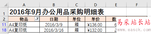 點擊下拉箭頭按鈕,其中已自動提取出這一列中的數據選項了。如果我們只想看復印紙購買了多少,那么去除其他選項,只勾選復印紙這項。