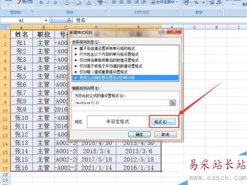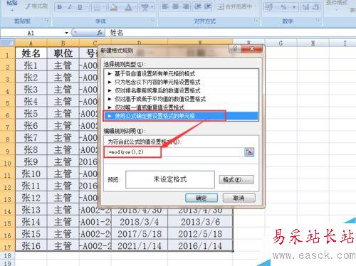 3、在打開的窗口中首先選擇“使用公式確定要設(shè)置格式的單元格”,然后在下方的輸入框輸入:=mod(roe(),2)