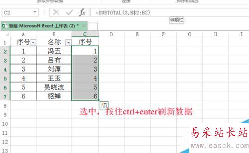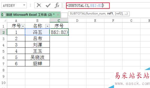4、輸入完整公式=subtotal(3,B$2:B2)。