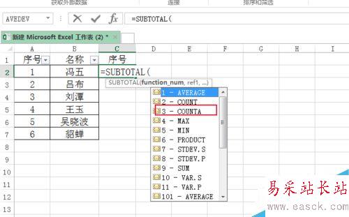 3、右側重新創建一個序號列,輸入=subtotal,選擇3。