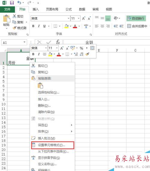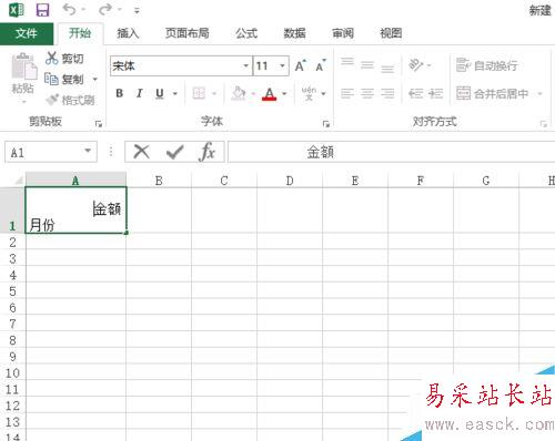 1、如下圖所示,首先將單元格的行高和列寬設置成你所希望得到的大小,然后在單元格中輸入“金額月份”