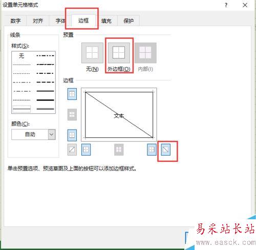 5、點擊【邊框】,選擇【外邊框】與圖中的左傾斜線