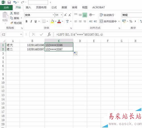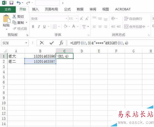 3、然后輸入公式:=LEFT(B2,3)&"****"&RIGHT(B2,4)