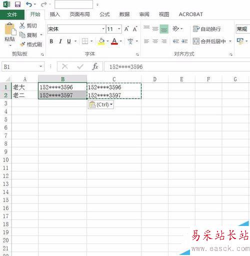 1、小編以兩個電話號碼為例,不論多少都可以用同樣的方法實現加密。