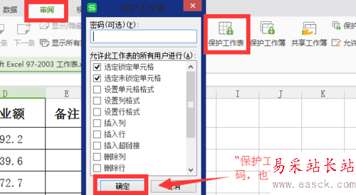 6、完成以上全部步驟之后,即返回excel表格;點擊最上欄功能菜單中的“審閱”按鈕,再點擊“保護工作表”;保護工作表可設置密碼,也可不設置密碼,再點擊“確定”按鈕;如圖所示;