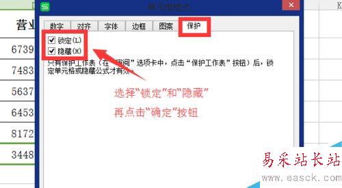 5、然后會出現“單元格格式”窗口,點擊最上欄的“保護”按鈕,再選擇“鎖定”和“隱藏”,最后點擊“確定”按鈕,如圖所示;