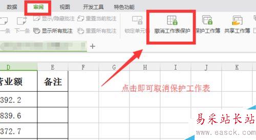 8、如果需要取消保護工作表,可點擊最上欄功能菜單中的“審閱”按鈕,再選擇“撤銷工作表保護”,即可取消保護工作表;如圖所示;