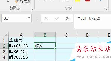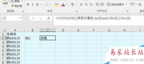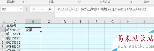 4、接下來(lái)就是要把歸屬地的數(shù)據(jù)引用到牌號(hào)文件中,可是想要在一個(gè)單元格內(nèi)完成顯示,當(dāng)前的文件內(nèi)容無(wú)法一步辦到,有人說(shuō)通過(guò)LEFT(A2,2),然后再C列使用VLOOKUP(B2,[牌照歸屬地.xlsx]Sheet1!$A:$C,2,FALSE)
