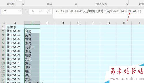 6、突然領(lǐng)導(dǎo)說(shuō)想要知道在那個(gè)市!還好我們有數(shù)據(jù)儲(chǔ)備,直接把函數(shù)VLOOKUP(LEFT(A2,2),[牌照歸屬地.xlsx]Sheet1!$A:$C,2,FALSE)中,F(xiàn)ALSE之前的2改成3,對(duì)應(yīng)歸屬地?cái)?shù)據(jù)的C列,然后填充到后面所有行就完成了