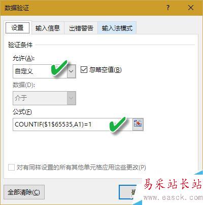 接下來在彈出的“數據驗證”對話框中選擇“設置”選項卡,在“允許”下拉列表框中選擇“自定義”選項(同時要選擇“忽略空值”選項);在“公式”下面的文本框中輸入:COUNTIF($1$65535,A1)=1