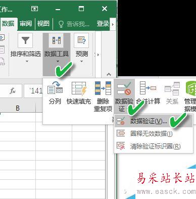 在工作表中選中需要設置重復檢查的所有單元格,然后單擊“數據”功能菜單,并在“數據工具”功能區域中選擇“數據驗證”選項,并單擊下級菜單中的第一個選項“數據驗證…”。
