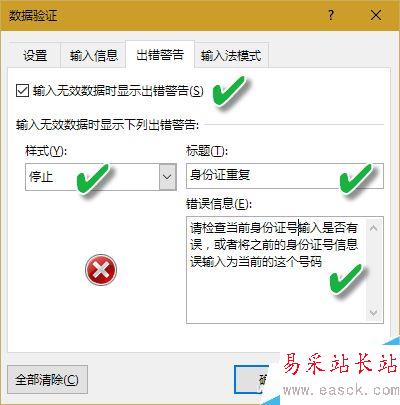 切換到“出錯警告”選項卡,在這里程序已經自動勾選了“輸入無效數據時顯示出錯警告”的復選框,接下來將“樣式”設置為“停止”選項,然后在右側的“標題”和“錯誤信息”兩個文本框中自行輸入相關的提示內容(如“身份證重復”)、具體的提示信息解釋(如“請檢查當前身份證號輸入是否有誤,或者將之前的身份證號信息誤輸入為當前的這個號碼”),然后單擊“確定”按鈕。