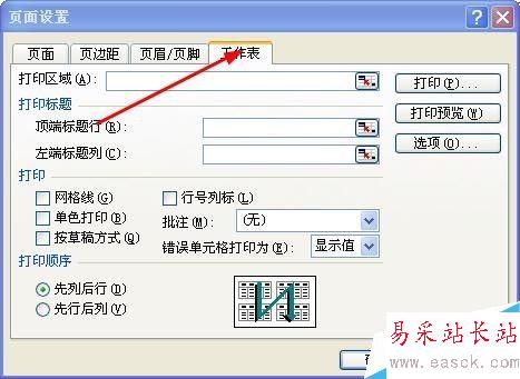 2、在彈出的頁(yè)面設(shè)置界面——工作表選項(xiàng)卡