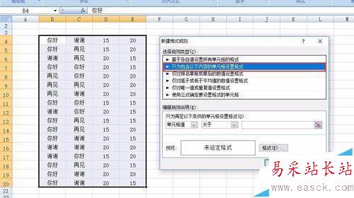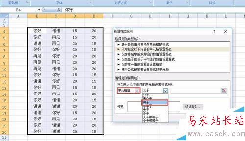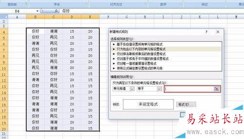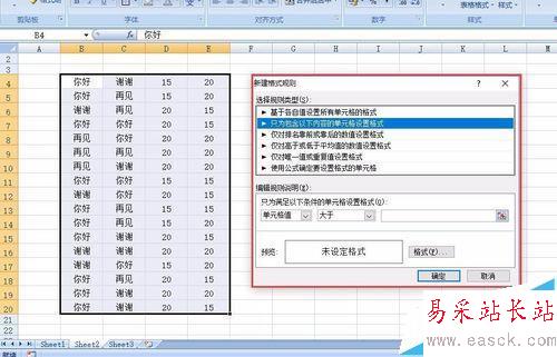 4、在選擇規則類型中選擇只為包含以下內容的單元格設置格式,在編輯規則說明中選擇單元格值和等于。