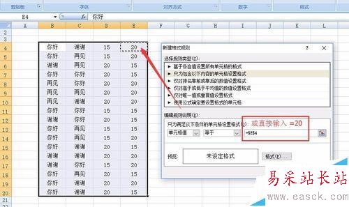 5、等于右邊的小方框上需要輸入詳細的要求,例如我們想在左邊的數值中不顯示“20”,那就直接點擊數值“20”的單元格,這時小方框上顯示“=$E$4”,或者我們可以手動輸入“=20”,這時等號(=)不可以省略哦。
