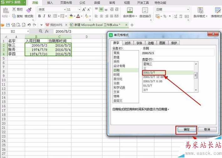 3、從彈出的菜筐中,選擇‘數(shù)字’,找見‘日期’,選擇如圖所示日期格式,點(diǎn)擊確定