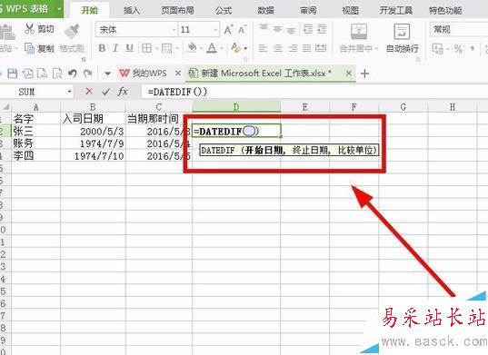 4、如圖所示,在兩個(gè)日期后面的表格里,輸入等號(hào),輸入DATEDIF,輸入哲哲函數(shù)的時(shí)候會(huì)跳出相應(yīng)提示,直接選擇即可