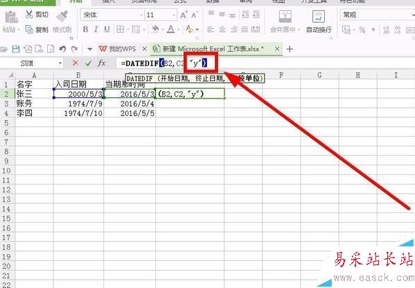 5、DATEDIF輸入后會(huì)跳出提示。開始日期,終止日期,比較單位,如圖所示,鼠標(biāo)點(diǎn)擊入司日期,點(diǎn)擊完后加英文字符的逗號(hào),再點(diǎn)擊當(dāng)前日期,點(diǎn)擊完后加英文字符的逗號(hào),輸入字母y