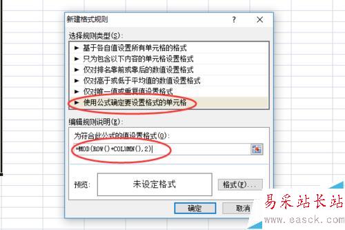 4、我們選擇最后一個規則,使用公式確定要設置格式的單元格。并輸入公式:=MOD(ROW()+COLUMN(),2)
