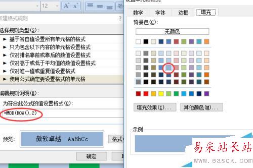 7、我們再次選擇剛剛設置的區域,單擊條件格式中的新建規則,這次我們輸入公式:=MOD(ROW()+COLUMN(),2)=0,并將設置底紋為淡藍色。