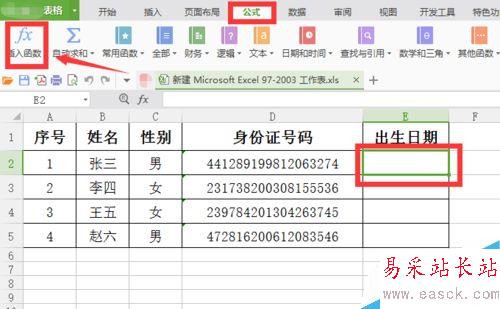 5、點擊“出生日期”下方的第一個空白格,然后再點擊表格最上方功能菜單中的“公式”按鈕,選擇其中的“插入函數”按鈕,如圖所示;