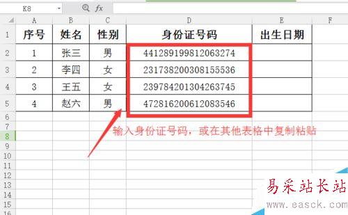 4、然后返回表格中,再正確輸入身份證號碼,或者在其他excel表格中復制粘貼過來,如圖所示;
