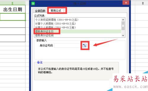 6、即可出現以下“插入函數”界面,選擇最上方的選項“常用公式”,然后點擊“提取身份證生日”,再點擊“參數輸入”中“身份證號碼”右邊的小方框,如圖所示;