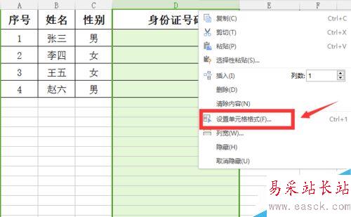 2、然后用鼠標選取身份證號碼所在的D列,再點擊鼠標右鍵,選擇其中的“設置單元格格式”,或者按鍵盤快捷鍵“Ctrl鍵”+“1鍵”代替;如圖所示;