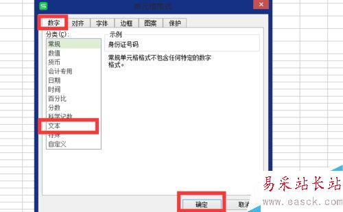 3、然后會出現以下界面,選擇菜單“數字”中的“文本”選項,再點擊下方的“確定”按鈕(該操作是為了能正確顯示身份證號碼),如圖所示;