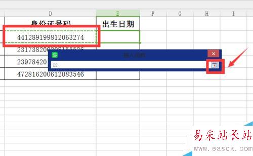 7、然后會出現以下界面,再用鼠標點擊身份證號碼的第一行,被選擇的格子周邊會呈虛線狀態,再點擊藍色窗口的最右邊小方框,如圖所示;