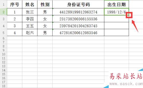 9、然后將鼠標箭頭放置到第一個出生日期格子的右下角,如圖紅色方框處;待鼠標箭頭呈“+”形狀時,按住鼠標左鍵往下拉(該操作是為了將下面的格子也有同樣的格式);