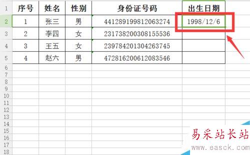 10、完成以上全部步驟之后,則將整個excel表格中身份證號碼的出生日期全部提取出來了,如圖所示;