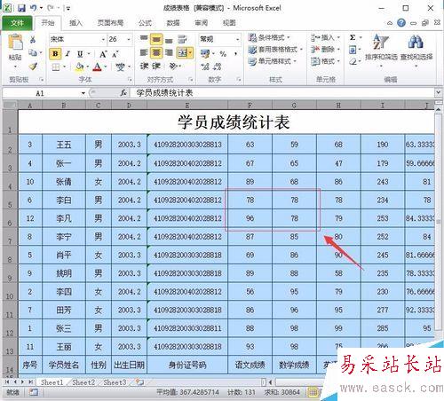 6、設置完成后,即可看到,整個數據表格按照數學成績進行了排序,然后當數學成績一樣的時候,就按照語文成績進行了排序。