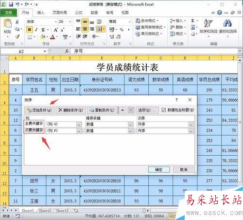 3、就可以看到一個彈出的對話框,在對話框中,可以選擇“排序的依據、排序的方式”等類目,根據用戶的選擇進行篩選,圖中選擇的是“數學成績和升序”的模式。
